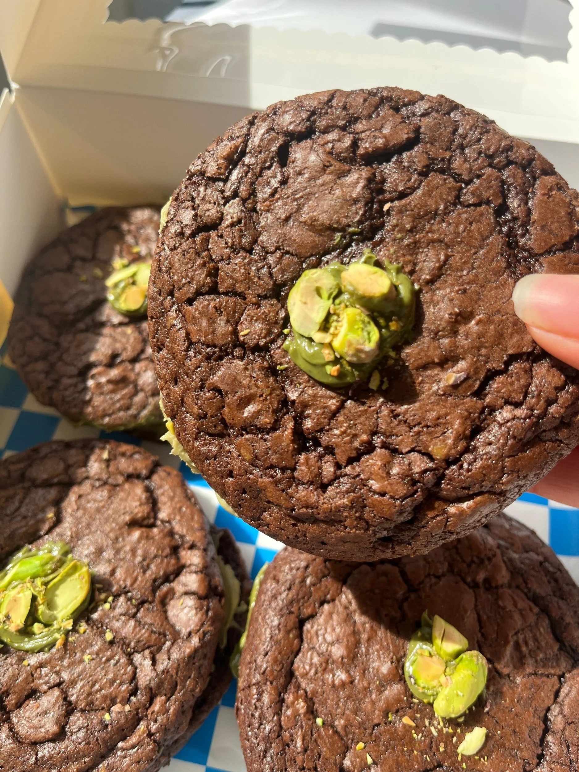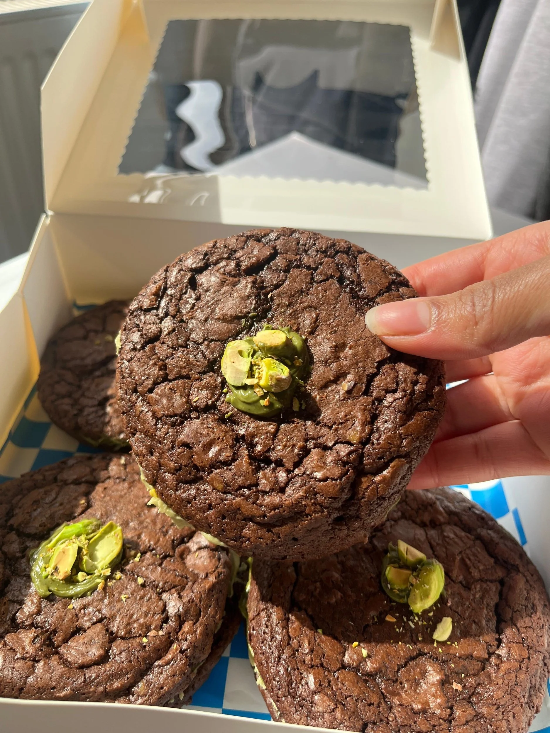 A rich fusion of fudgy brownie and soft cookie, swirled with nutty pistachio flavour and studded with melty chocolate chunks, crisp at the edges with a dense, indulgent centre.