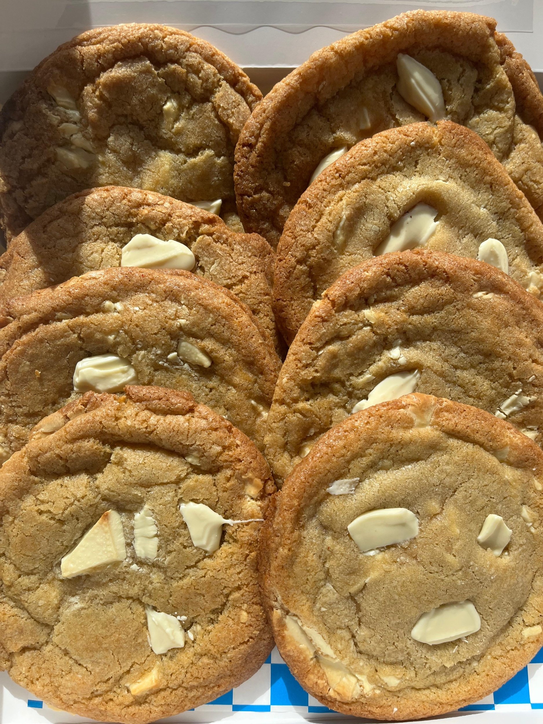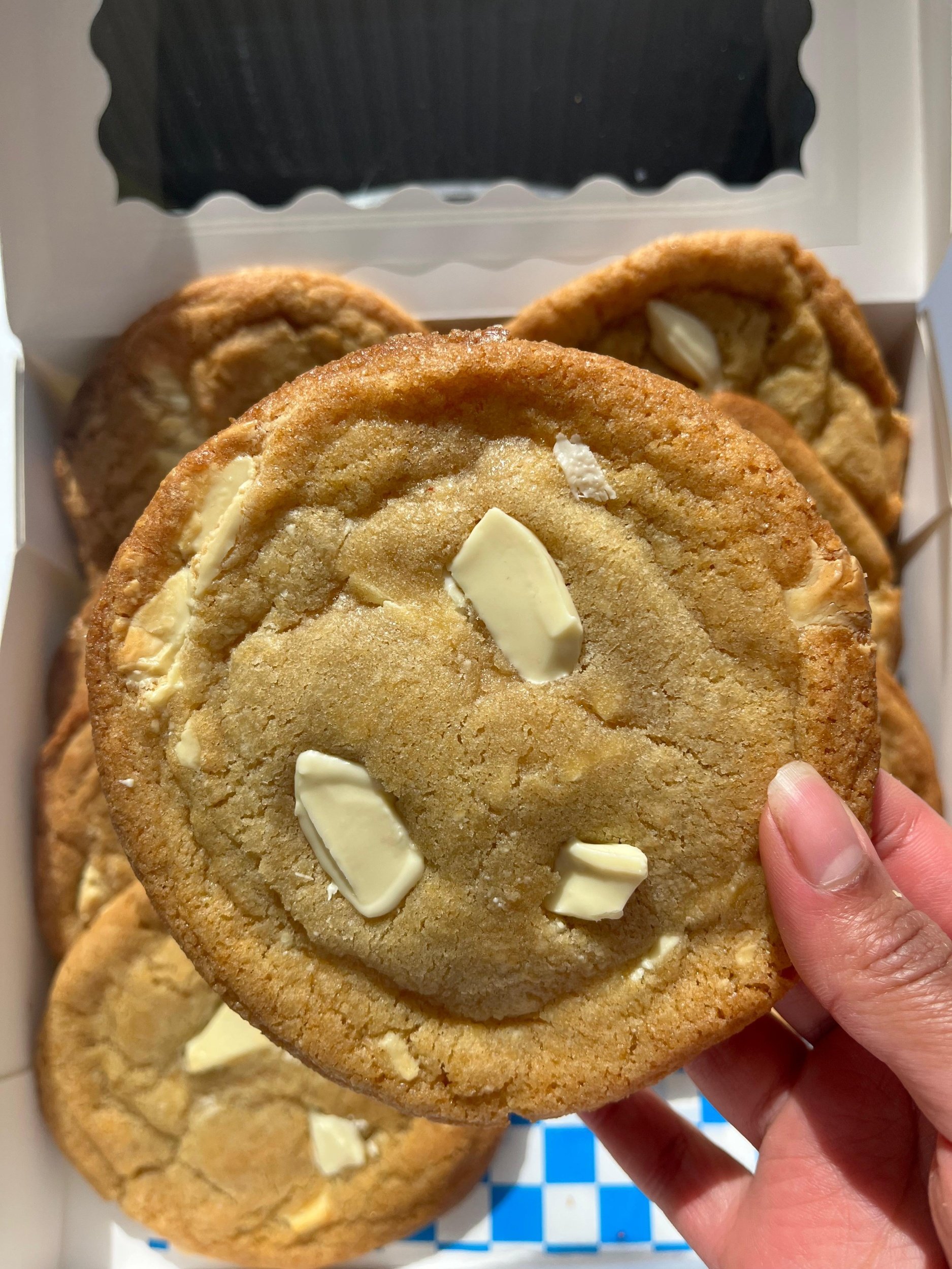 Buttery, golden-baked cookie packed with creamy white chocolate chunks, lightly crisp on the outside with a soft, velvety centre that melts into sweet, milky richness.