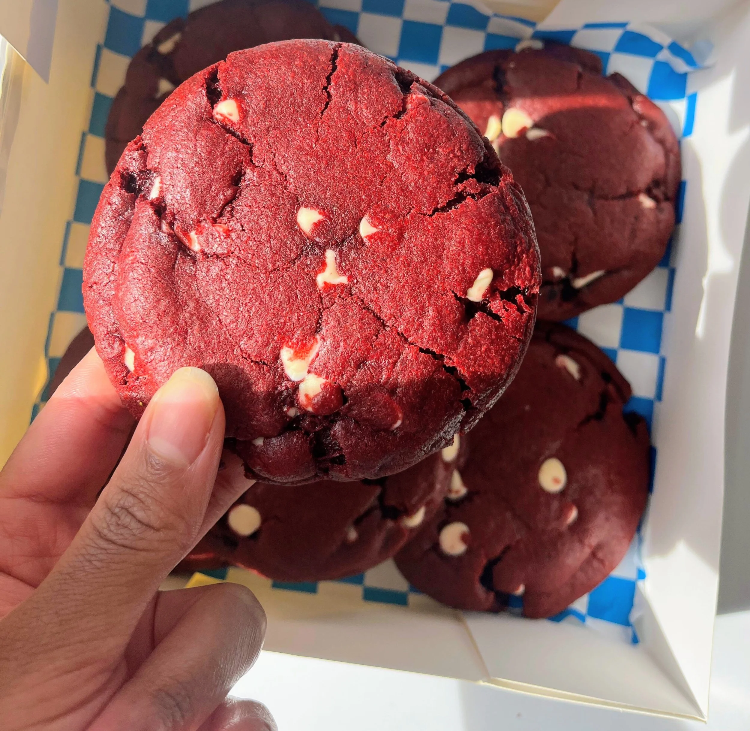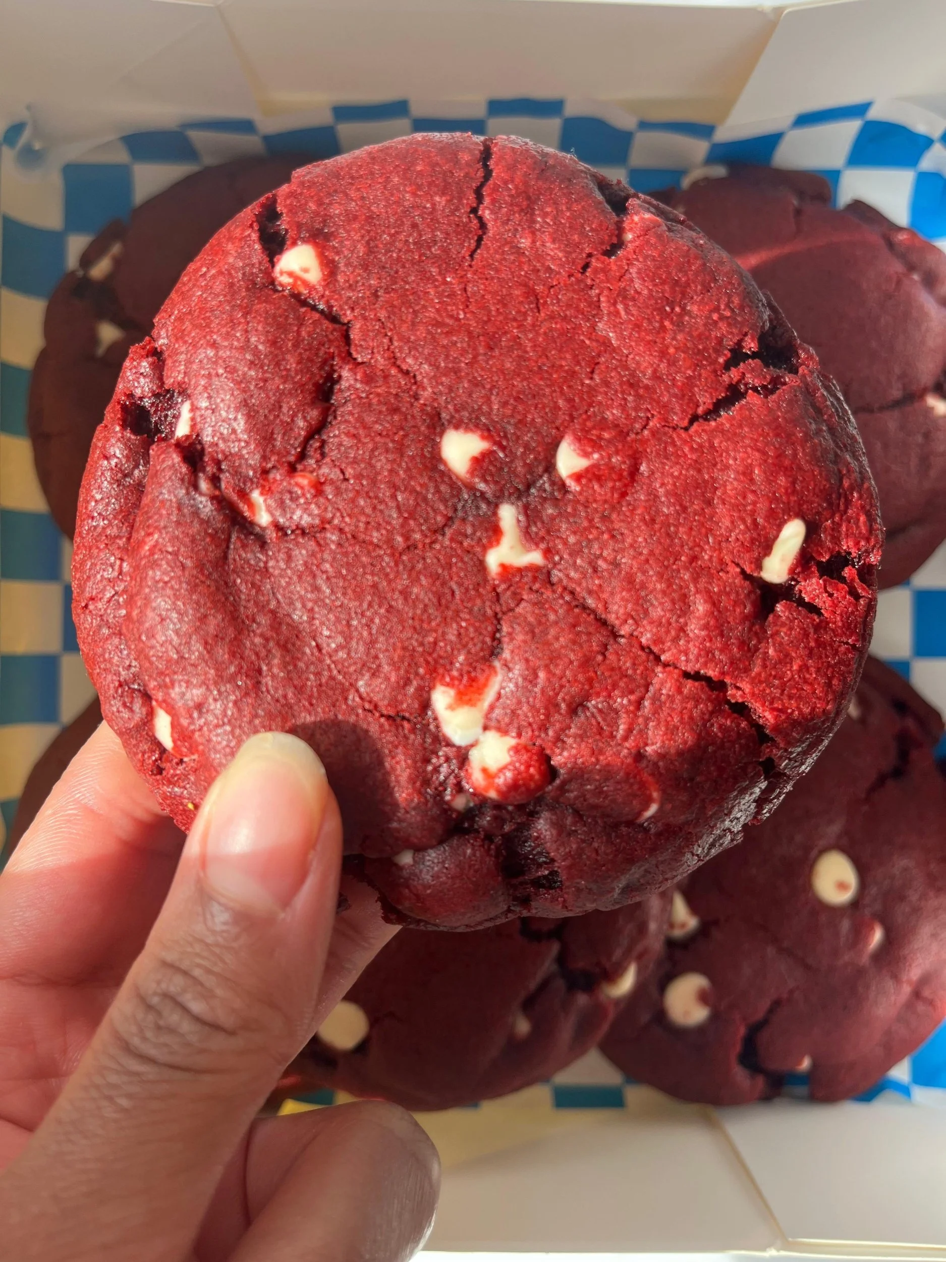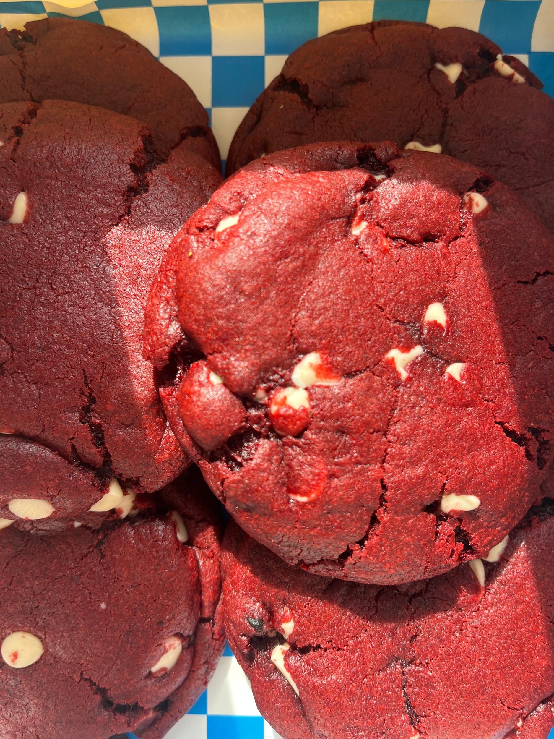 Soft, velvety red cocoa cookie with a hint of vanilla, baked to a tender centre with lightly crisp edges and studded with creamy white chocolate chunks for a rich, smooth finish.
